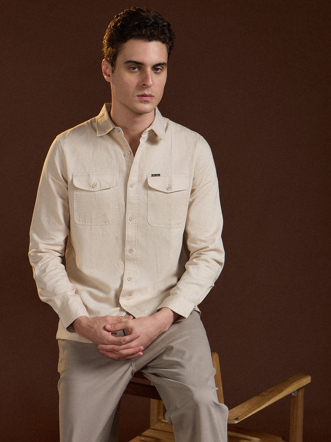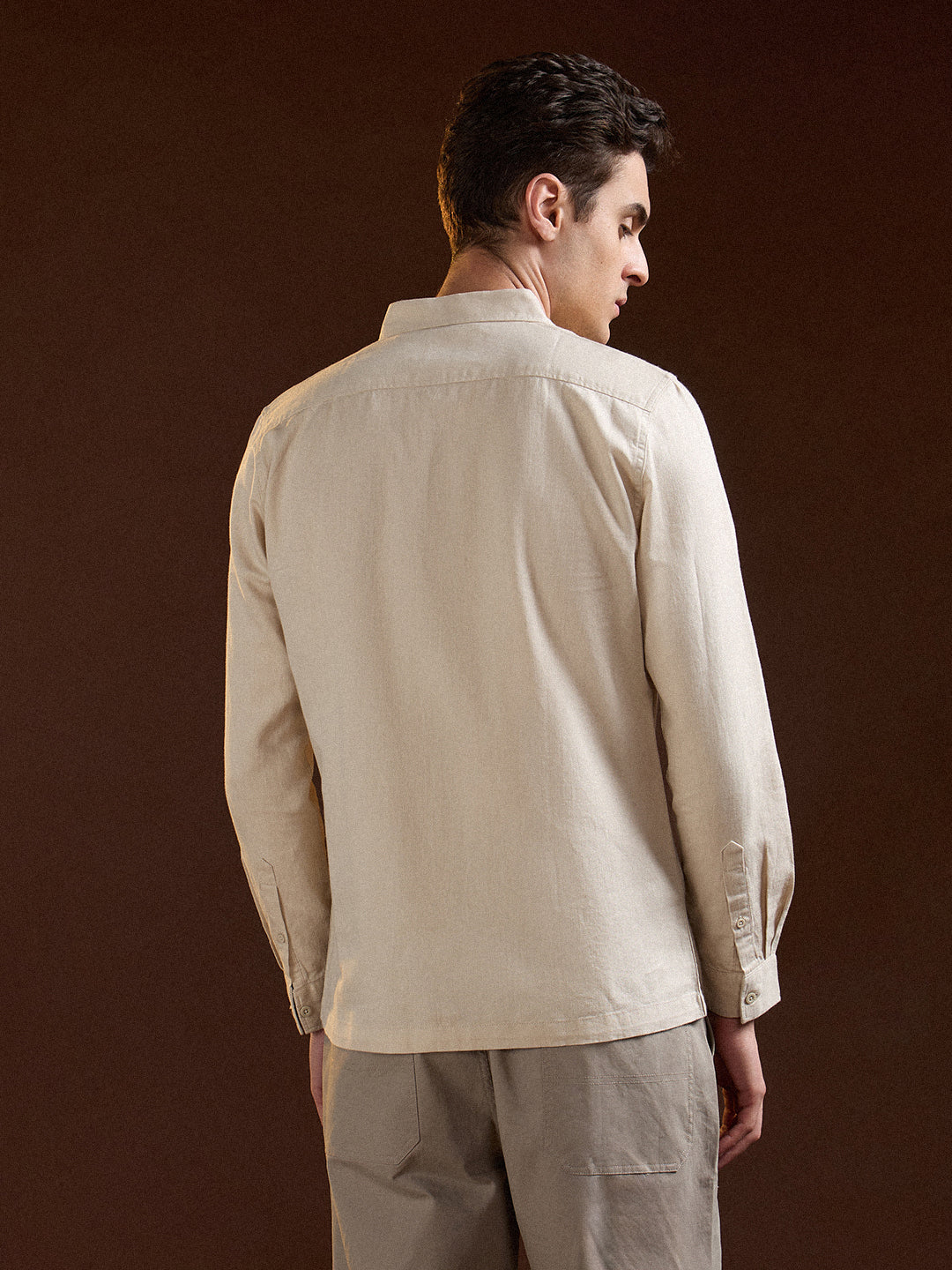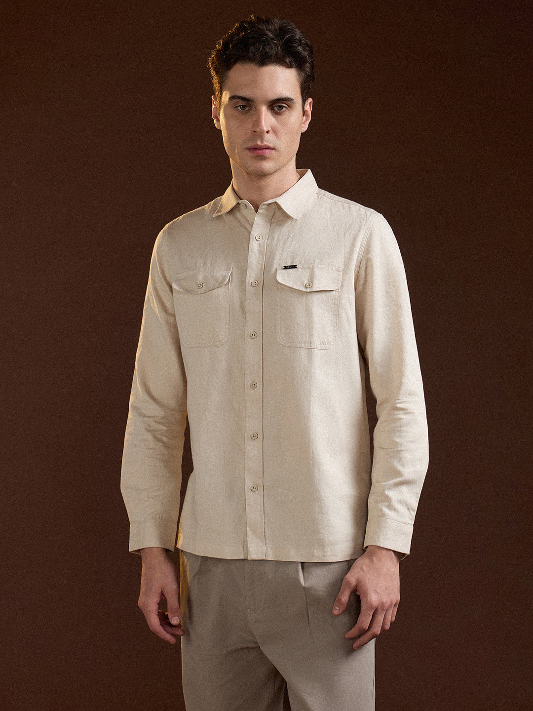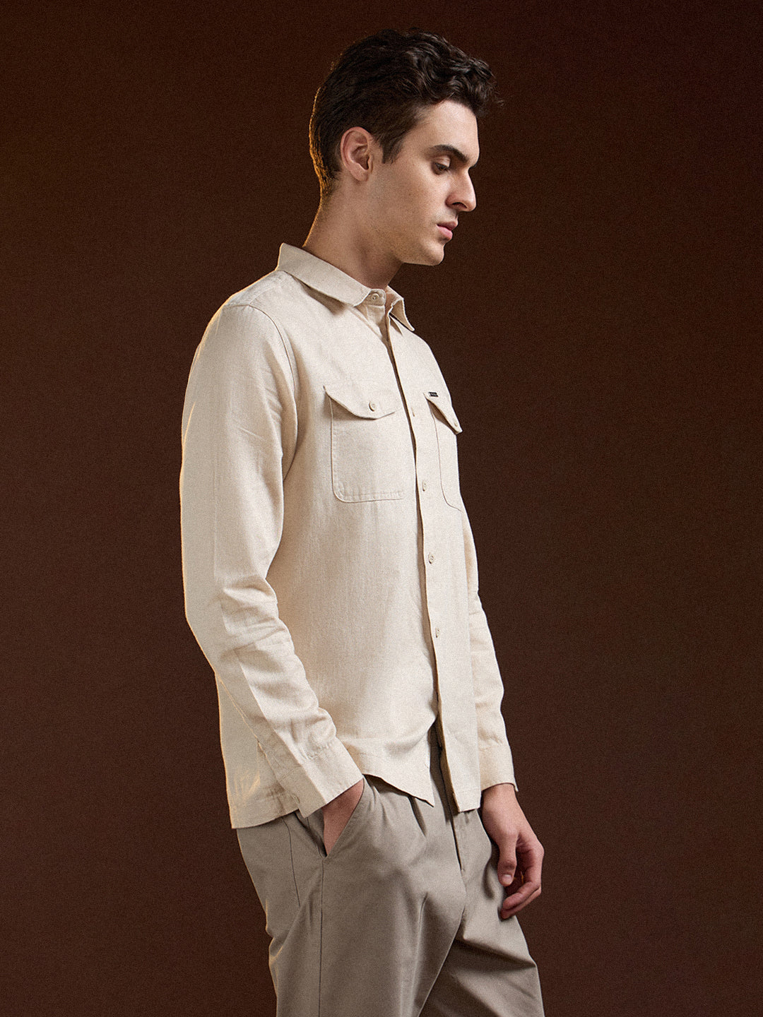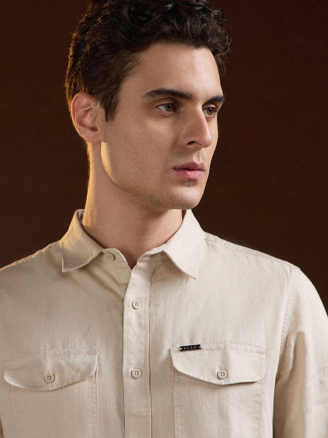 Beige Solid Slim Fit Casual Shirt with Flap Pockets