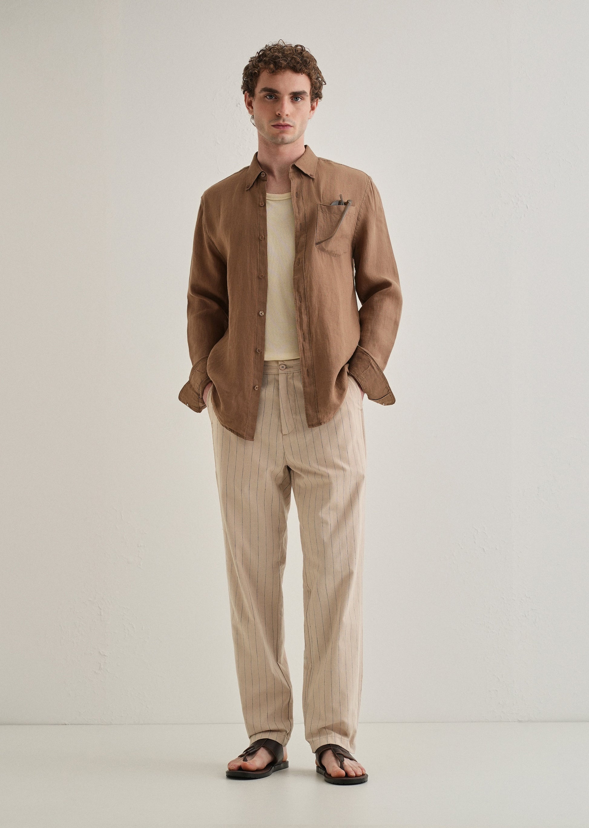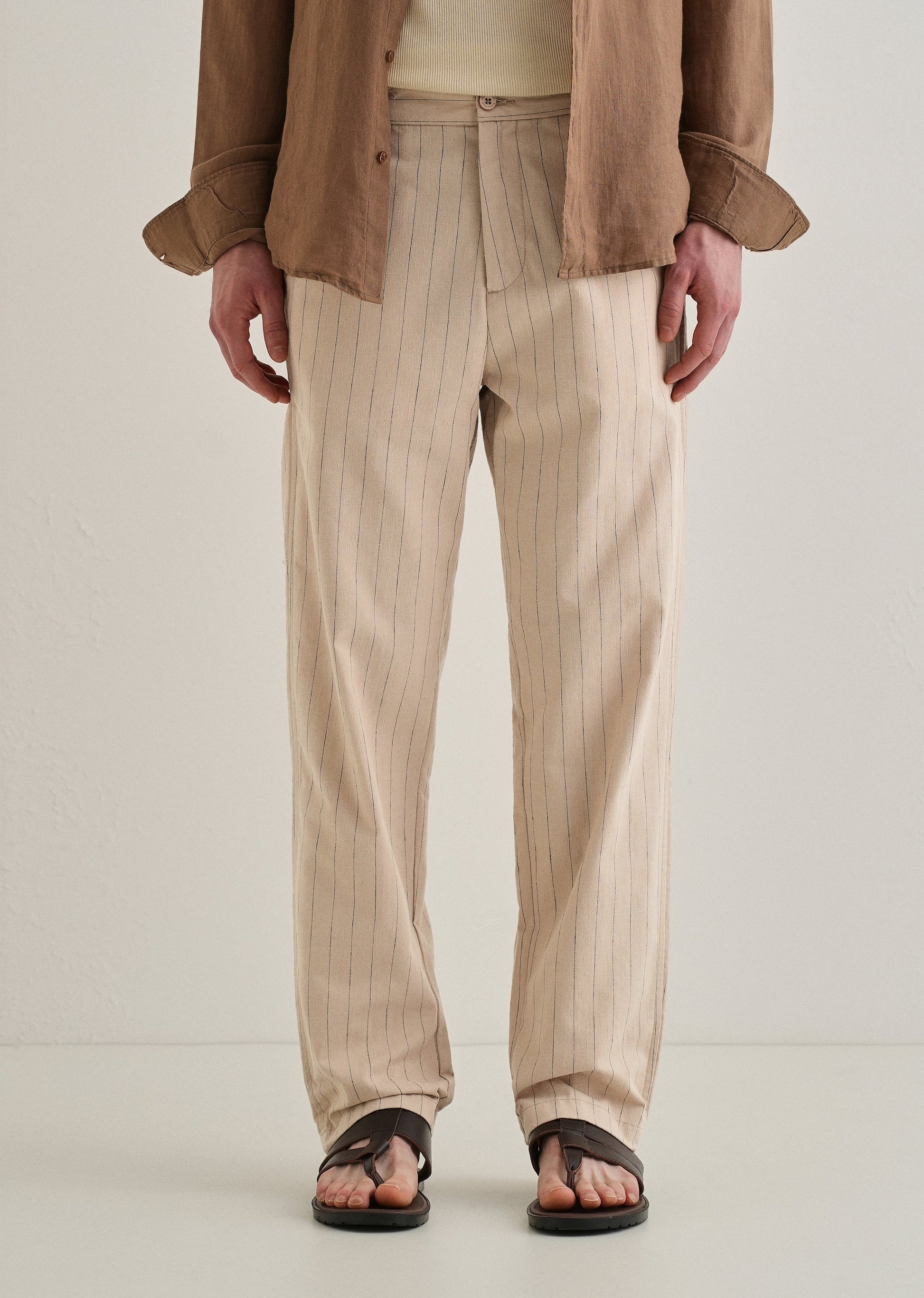 Step into effortless style with these pinstripe trousers. Tailored for comfort and a smart-casual look, they feature a relaxed fit with an adjustable drawstring waist. The soft fabric and elasticated waistband at the back to ensure all-day ease, while the classic vertical stripes add a modern, polished touch. Finished with side pockets and a back welt pocket, these trousers are perfect for both everyday wear and dressed-up occasions.