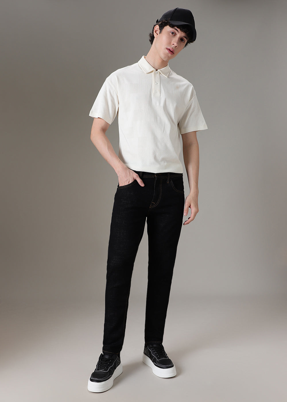 - Regular waist and a zip fly.
