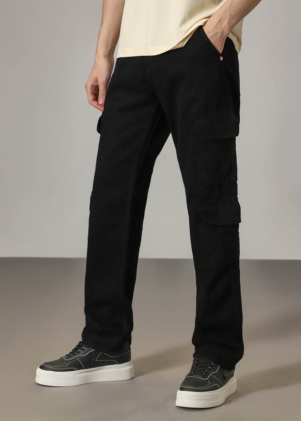 - Cargo Denim in sturdy cotton with a zip fly and button.
