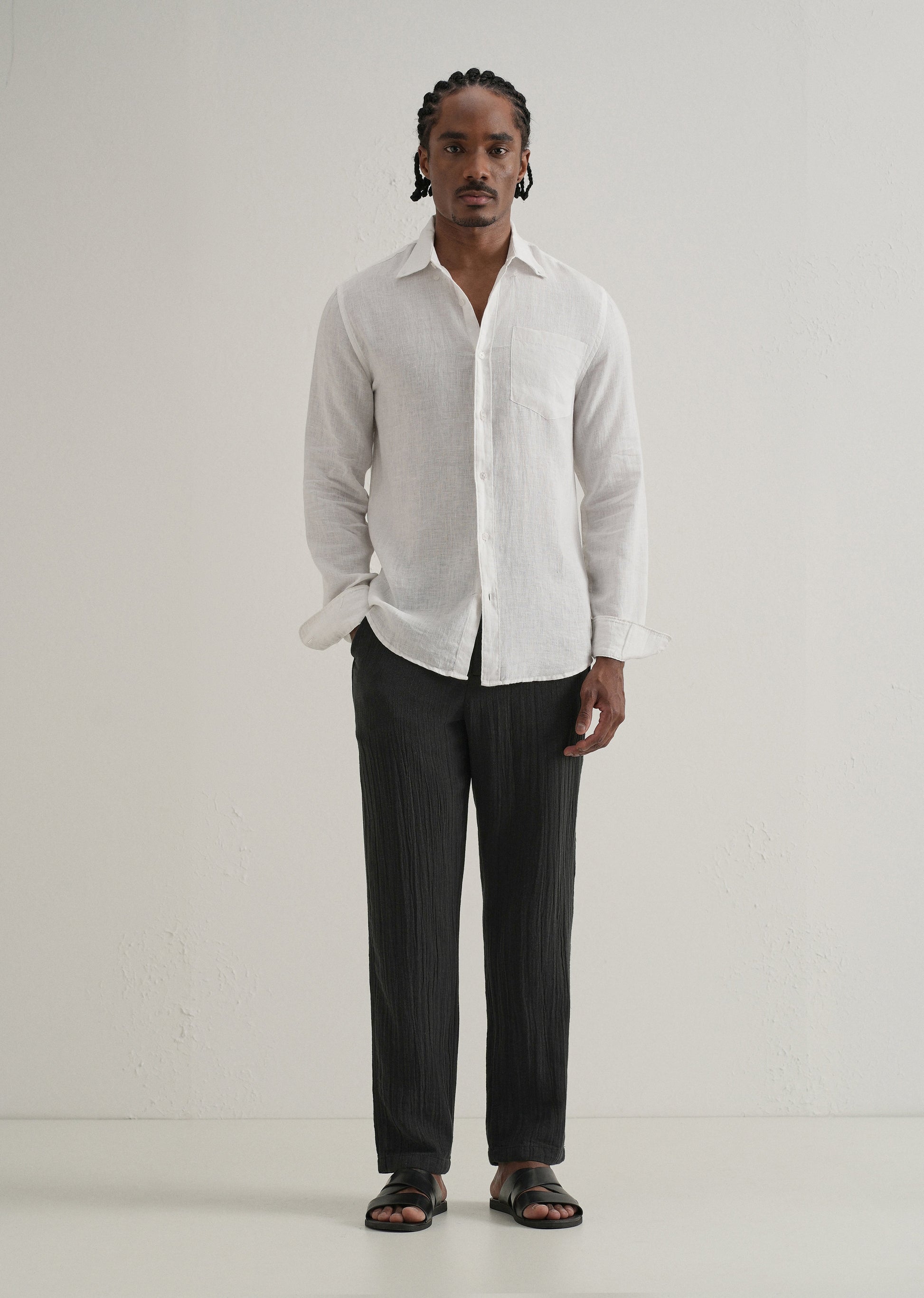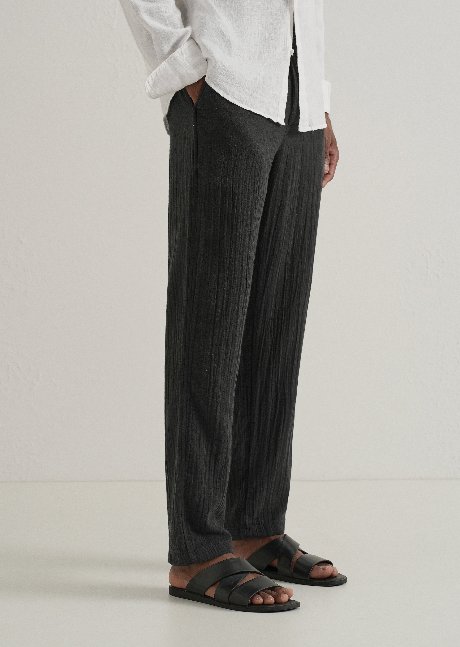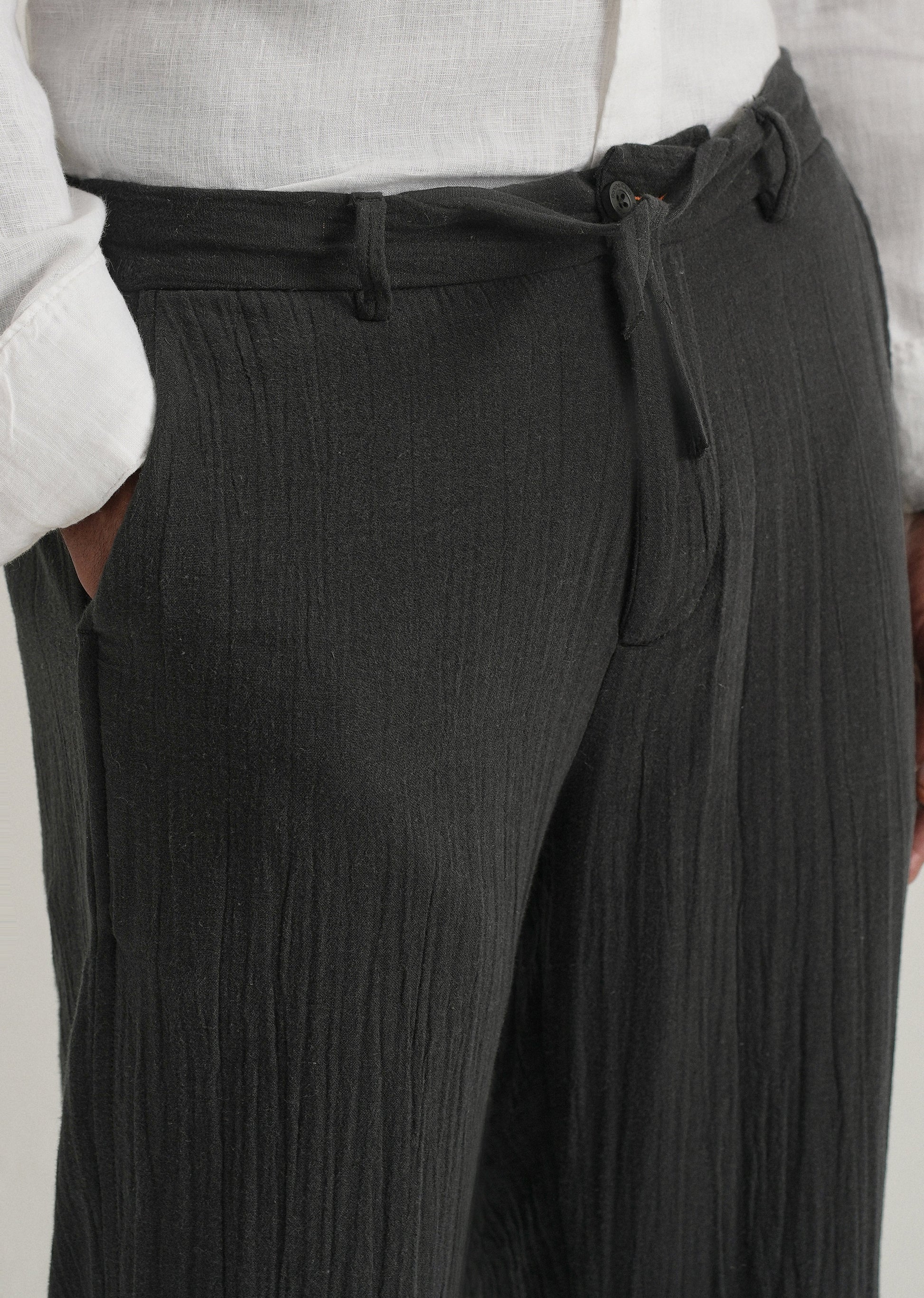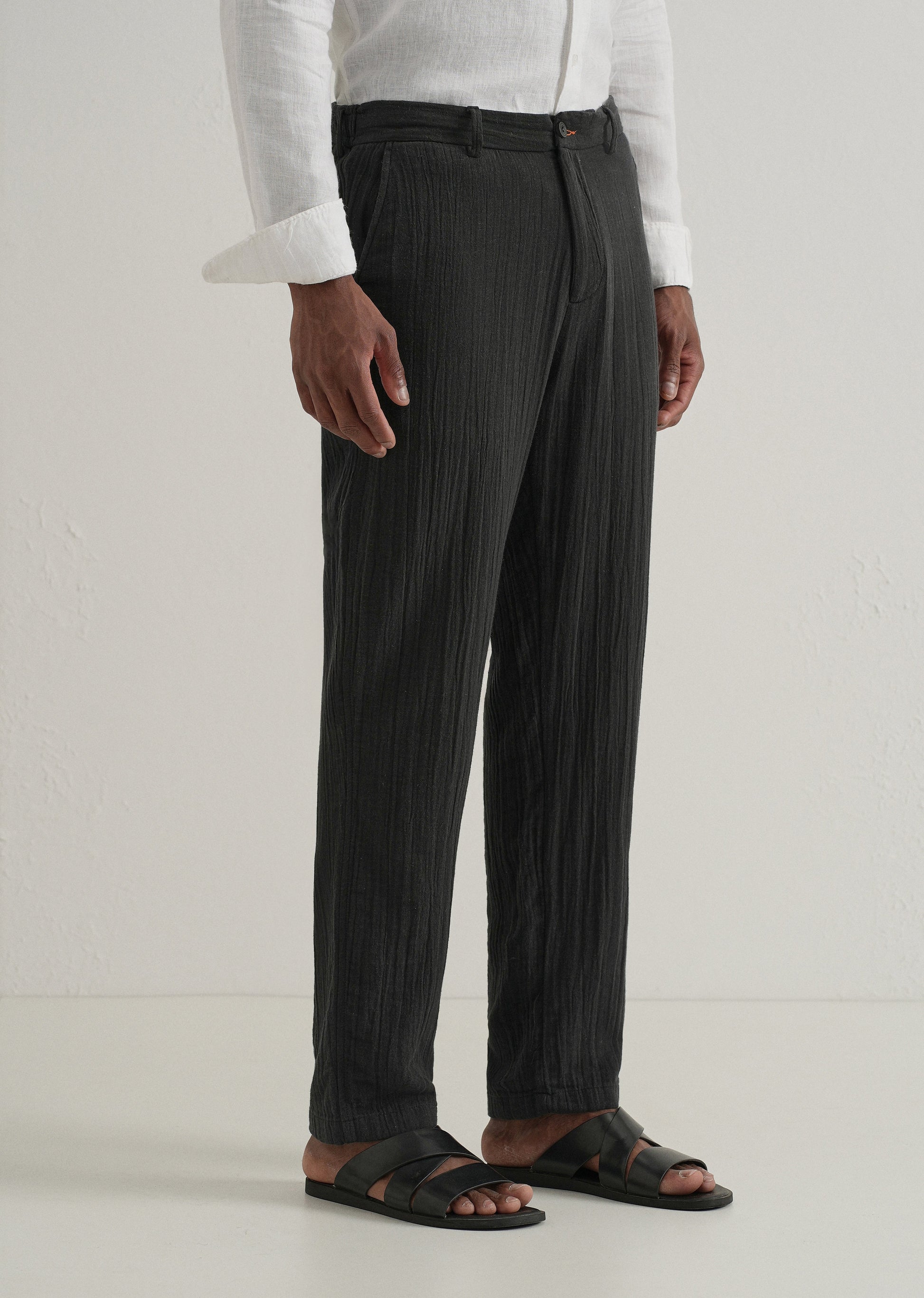 Step into comfort and style with these textured trousers, designed for a perfect balance of comfort and sophistication. Made from lightweight, breathable fabric with a crinkled effect, these trousers feature a mid-rise waist, button-and-zip closure, and belt loops for versatile styling. The straight relaxed fit ensures all-day comfort, while the welt pockets at the back add a clean, tailored finish. These trousers effortlessly blend style and functionality.