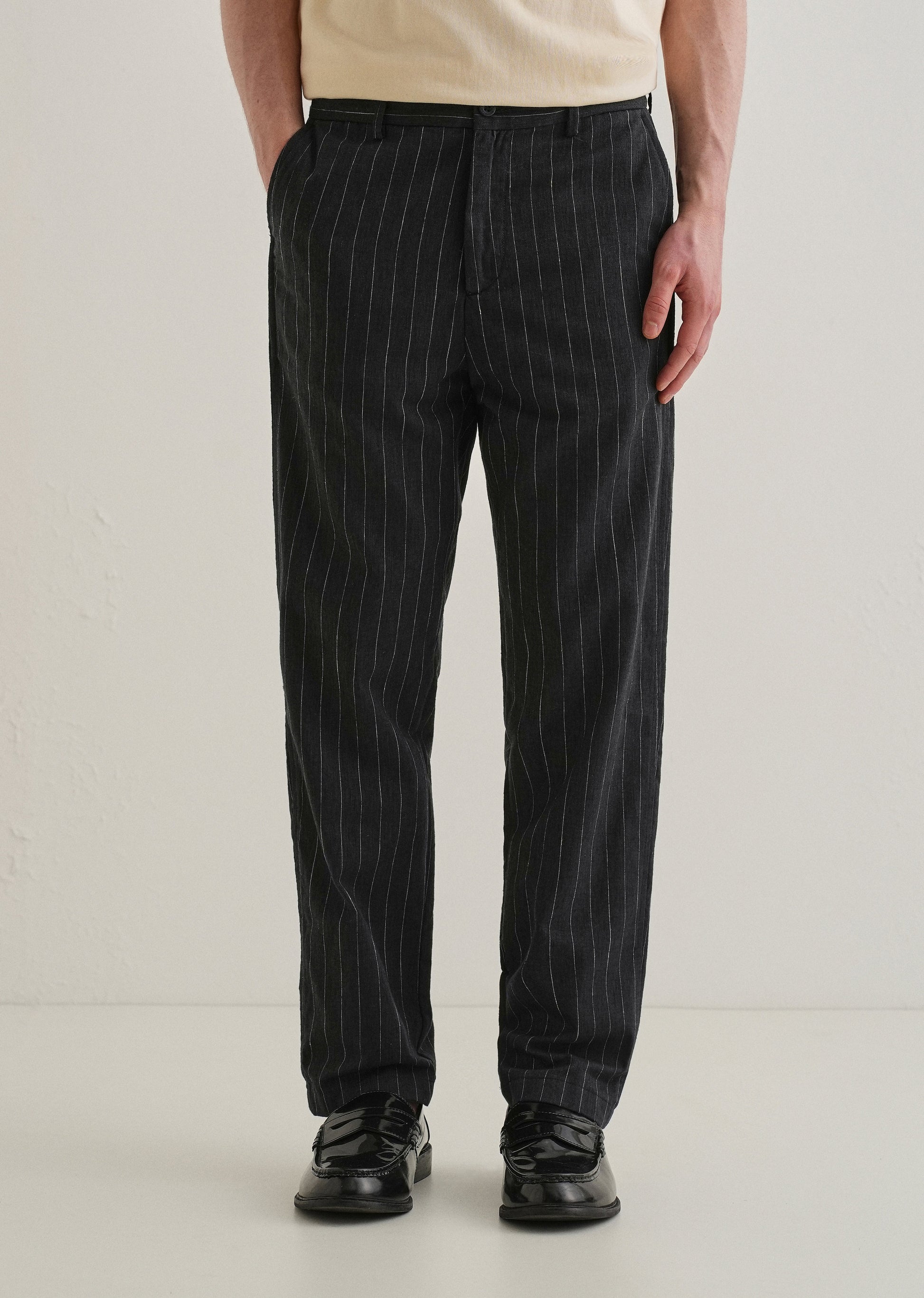 Step into effortless style with these pinstripe trousers. Tailored for comfort and a smart-casual look, they feature a relaxed fit with an adjustable drawstring waist. The soft fabric and elasticated waistband at the back to ensure all-day ease, while the classic vertical stripes add a modern, polished touch. Finished with side pockets and a back welt pocket, these trousers are perfect for both everyday wear and dressed-up occasions.