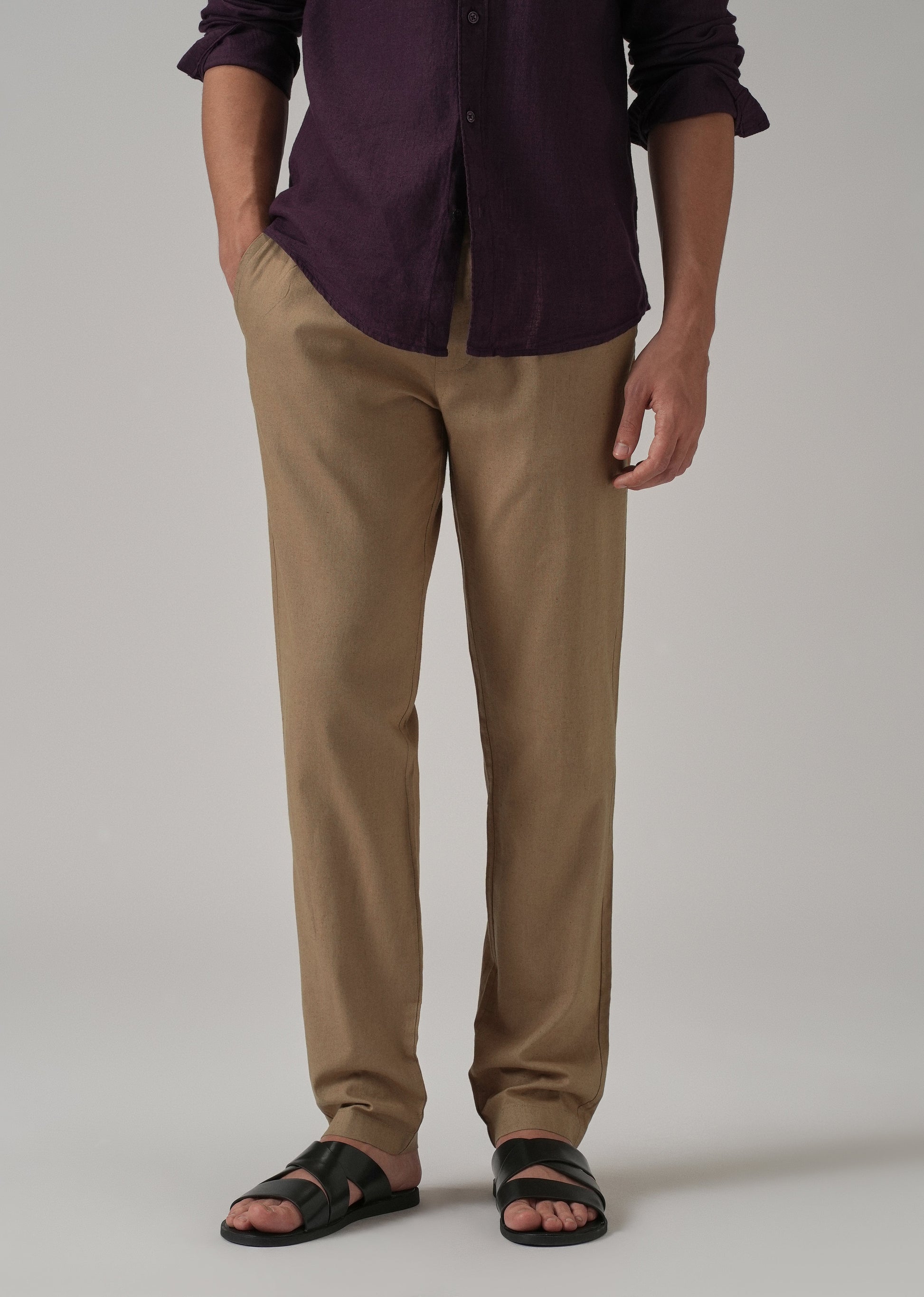 Comfort meets versatility. Designed with an elasticated waist and adjustable drawstring, these pants offer a perfect balance of ease and style. Featuring two front pockets and two welt pockets at the back, they provide both function and a clean look. The linen-cotton blend ensures breathability, making them ideal for all-day wear.