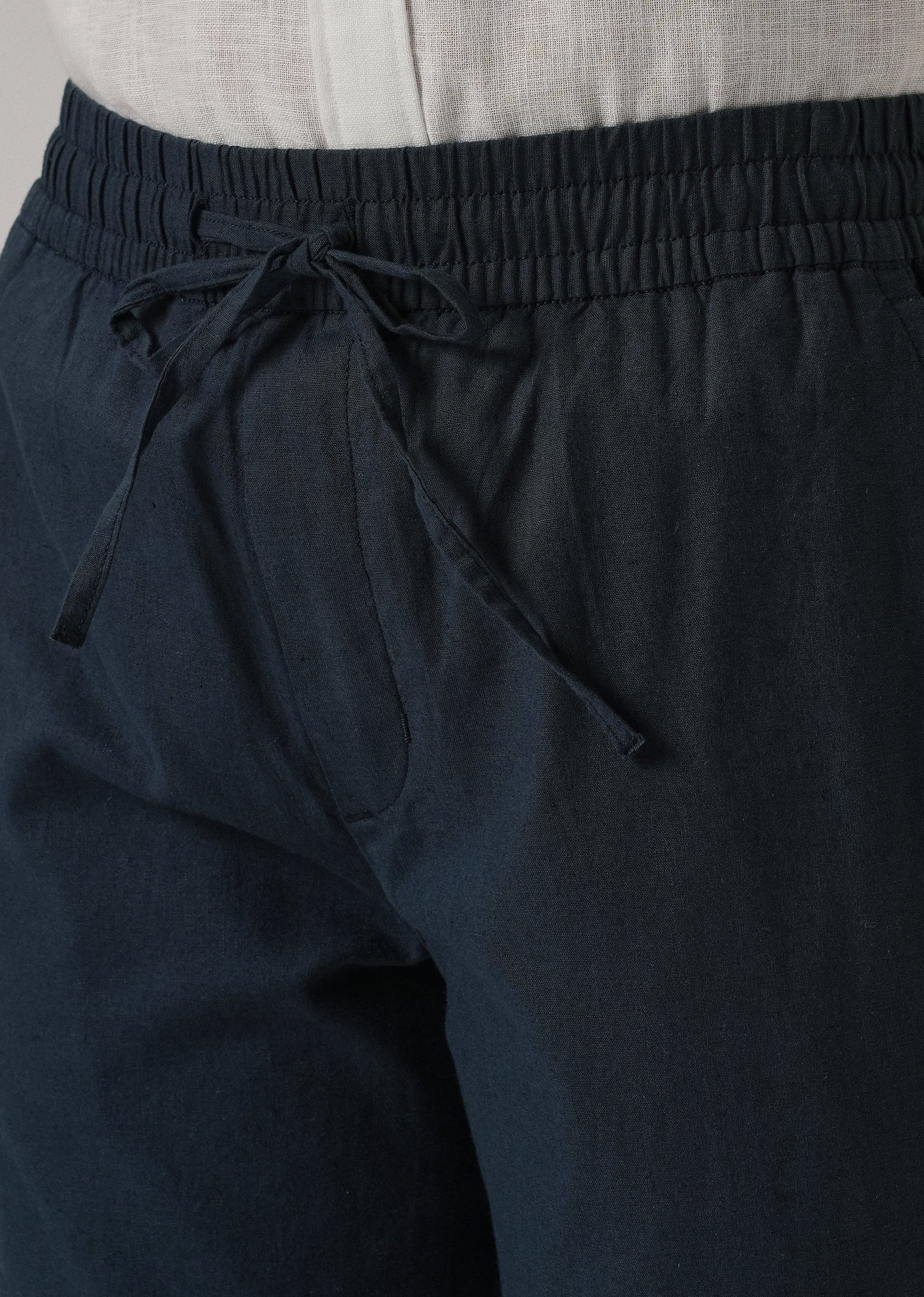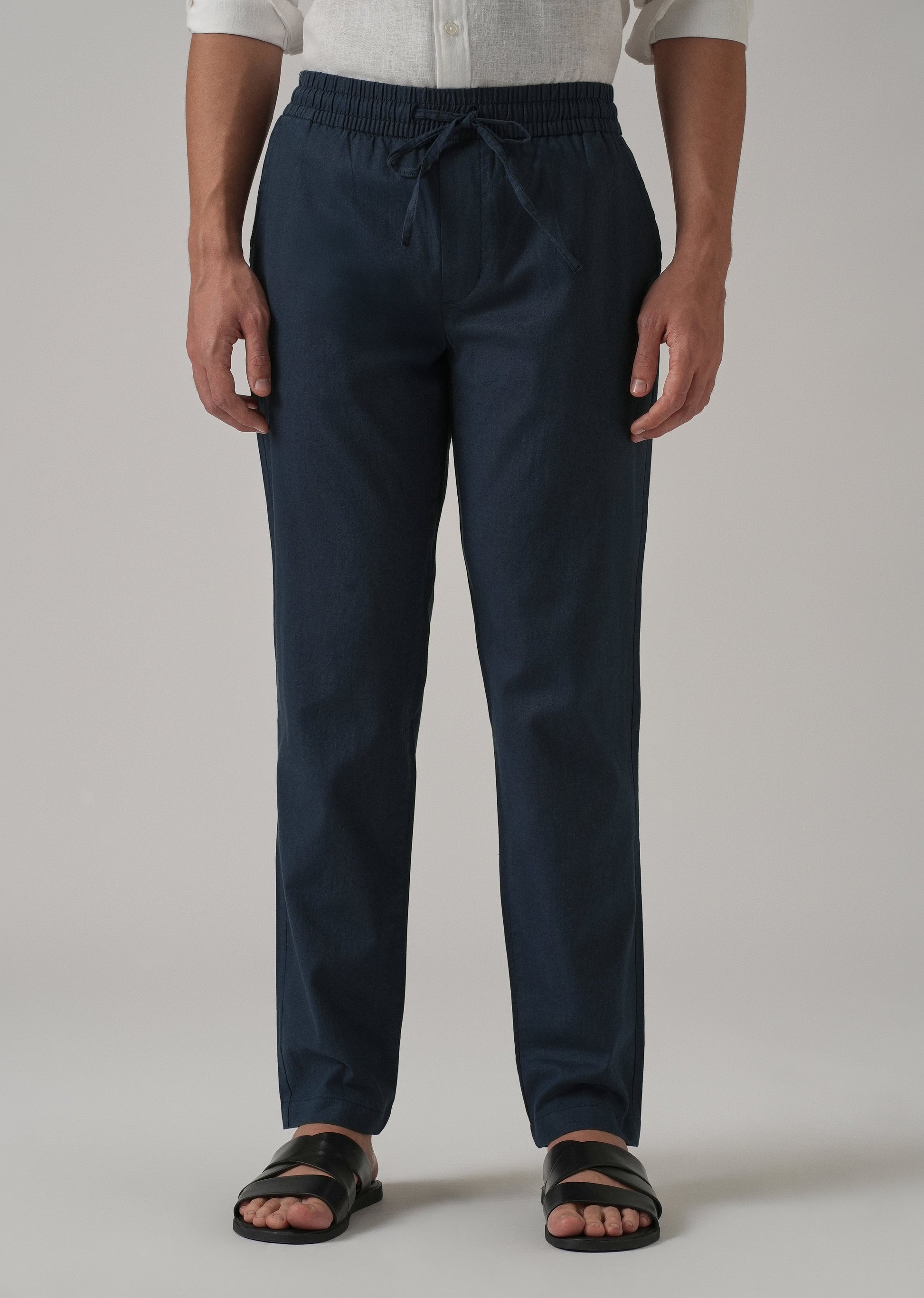 Comfort meets versatility. Designed with an elasticated waist and adjustable drawstring, these pants offer a perfect balance of ease and style. Featuring two front pockets and two welt pockets at the back, they provide both function and a clean look. The linen-cotton blend ensures breathability, making them ideal for all-day wear.