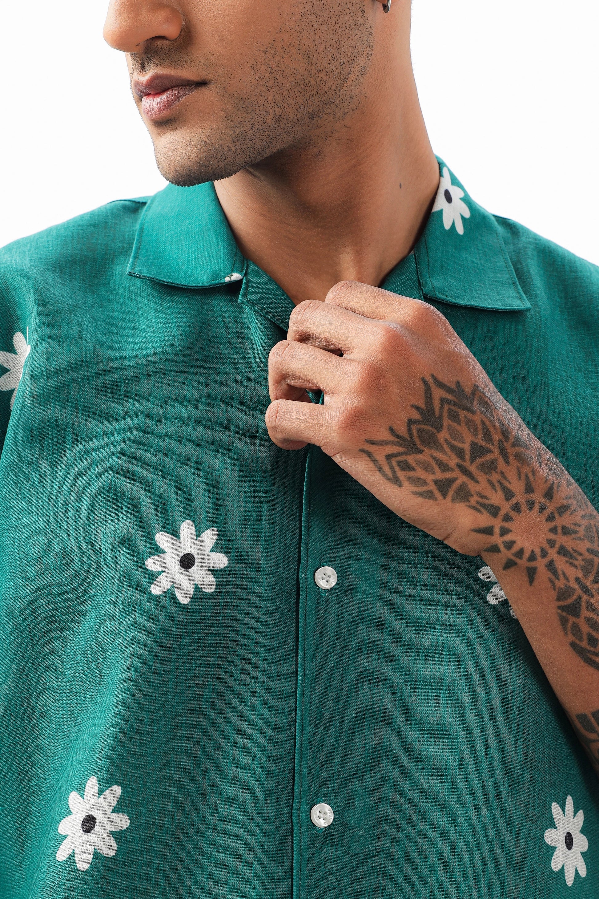 Green flower printed linen shirt