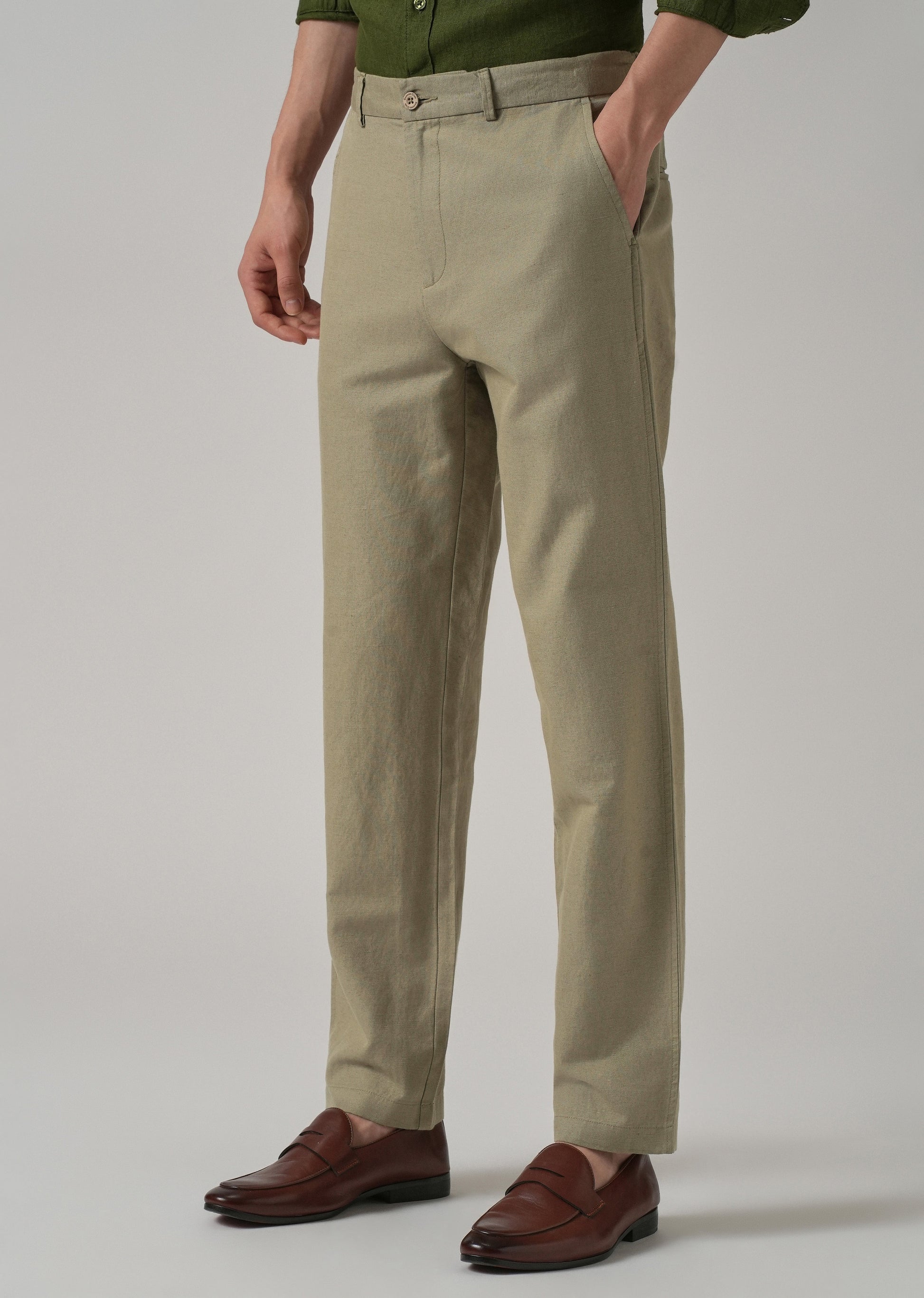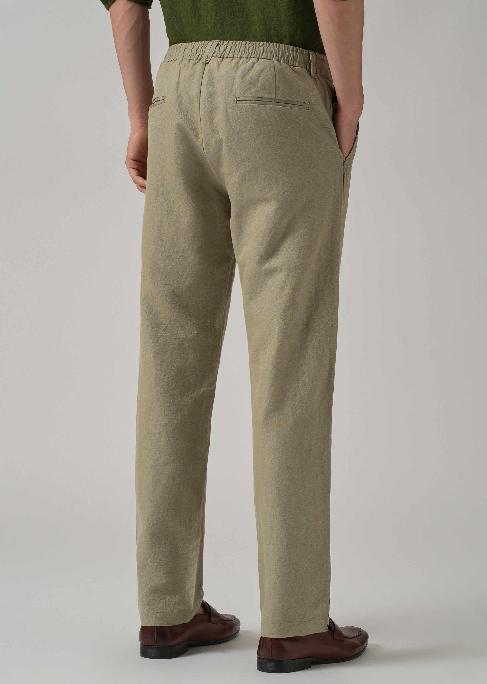 These versatile trousers feature a semi-elasticated waistband for added comfort and a button closure with belt loops for a personalized fit. With two side pockets and two welt pockets at the back. The relaxed fit offers comfortable feel.