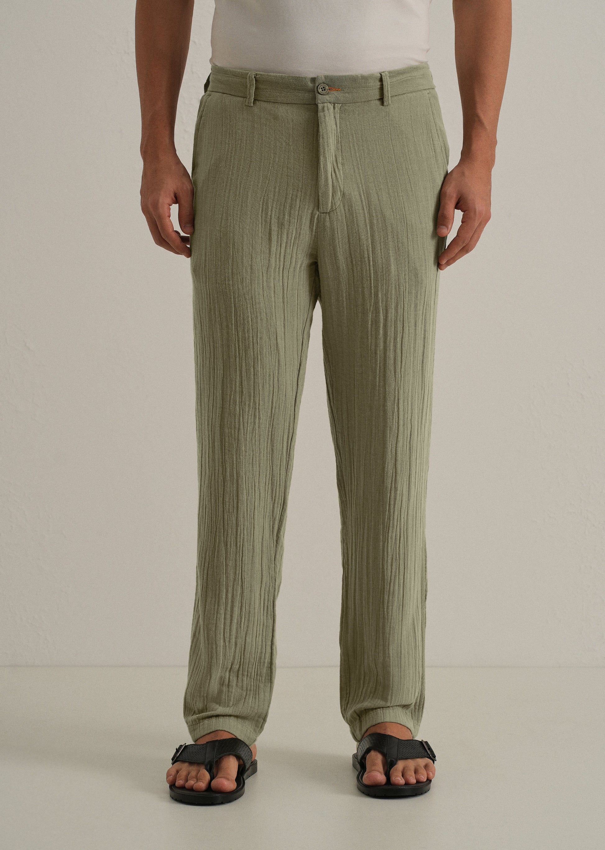 Step into comfort and style with these textured trousers, designed for a perfect balance of comfort and sophistication. Made from lightweight, breathable fabric with a crinkled effect, these trousers feature a mid-rise waist, button-and-zip closure, and belt loops for versatile styling. The straight relaxed fit ensures all-day comfort, while the welt pockets at the back add a clean, tailored finish. These trousers effortlessly blend style and functionality.