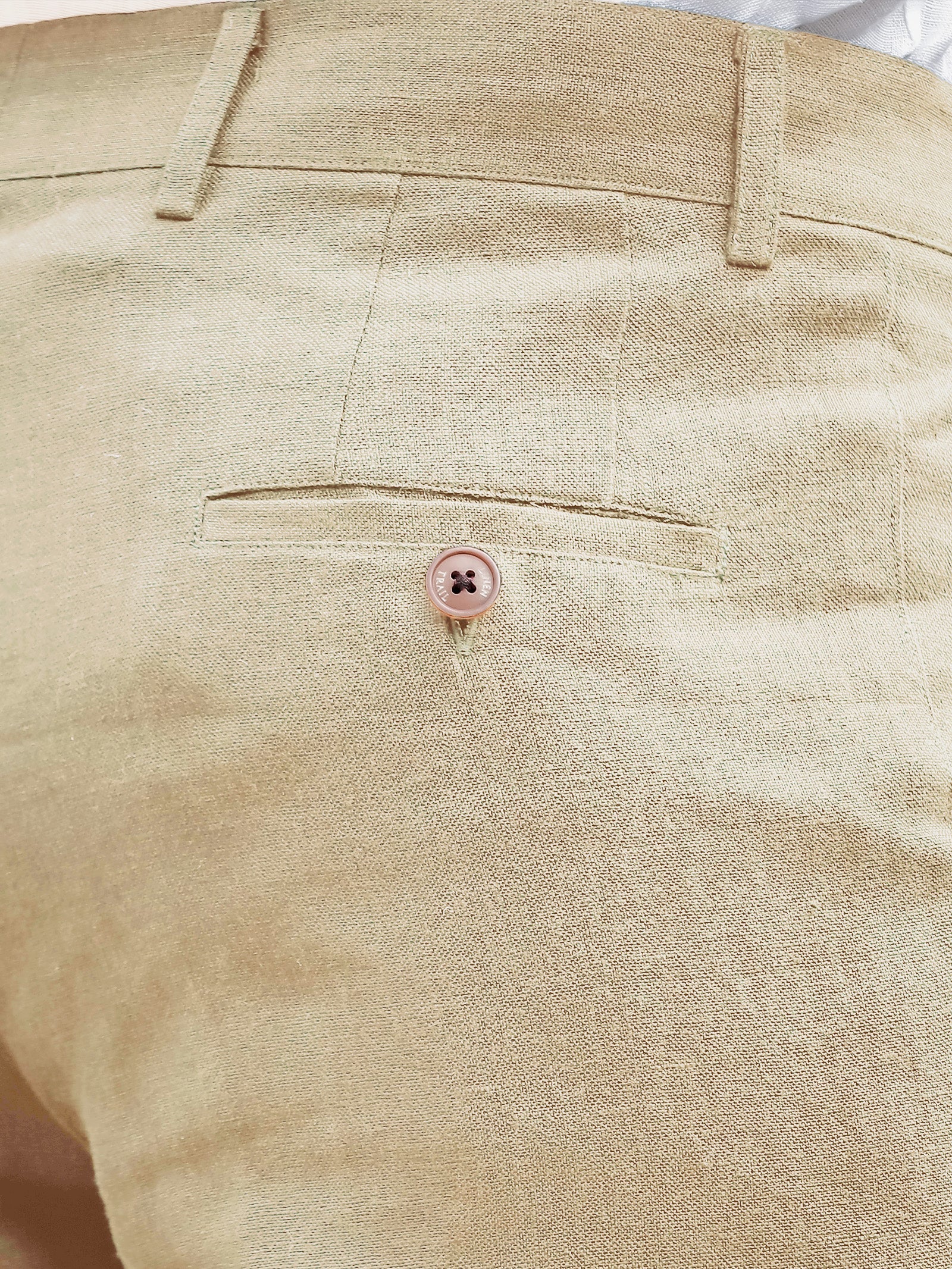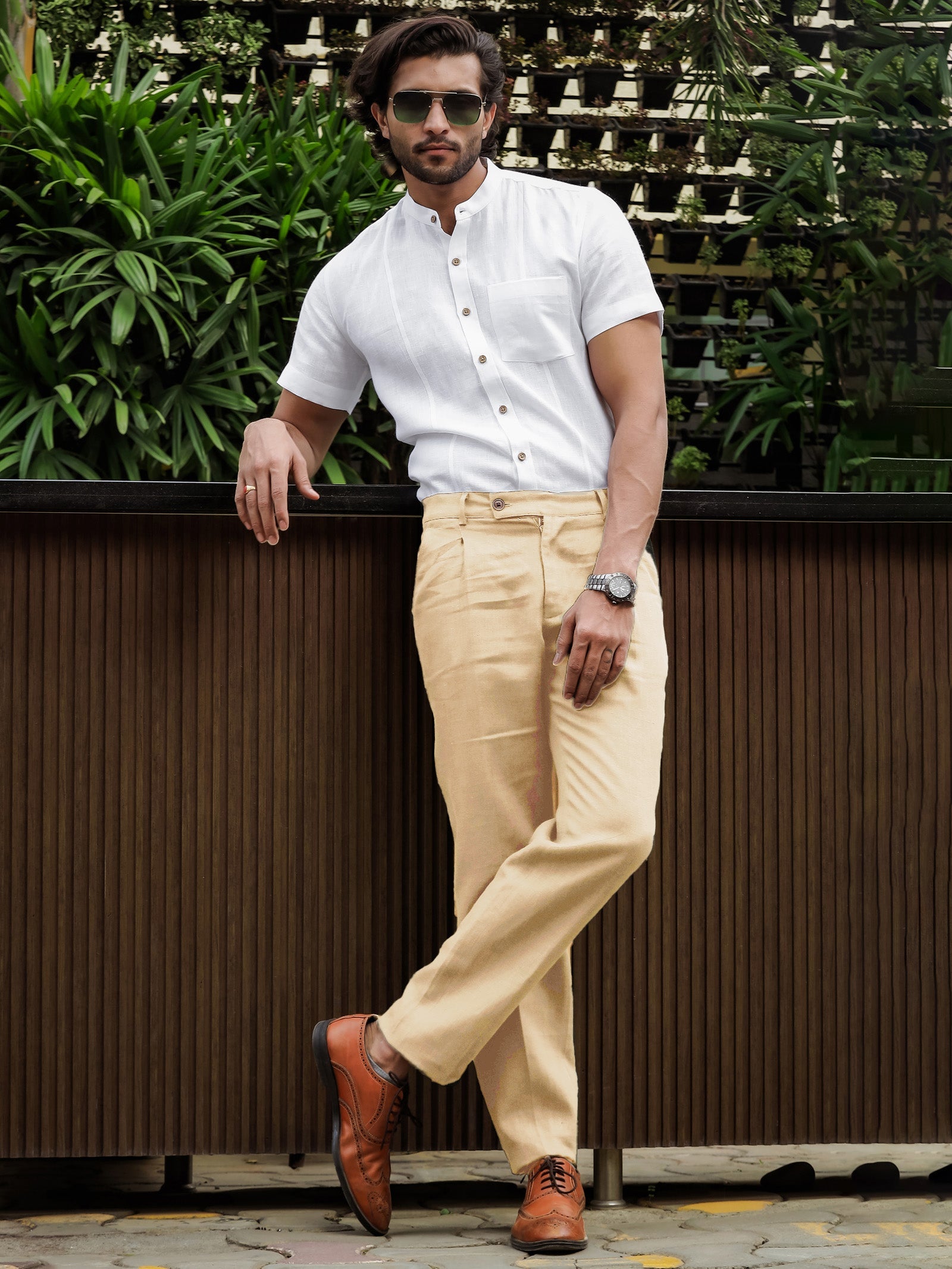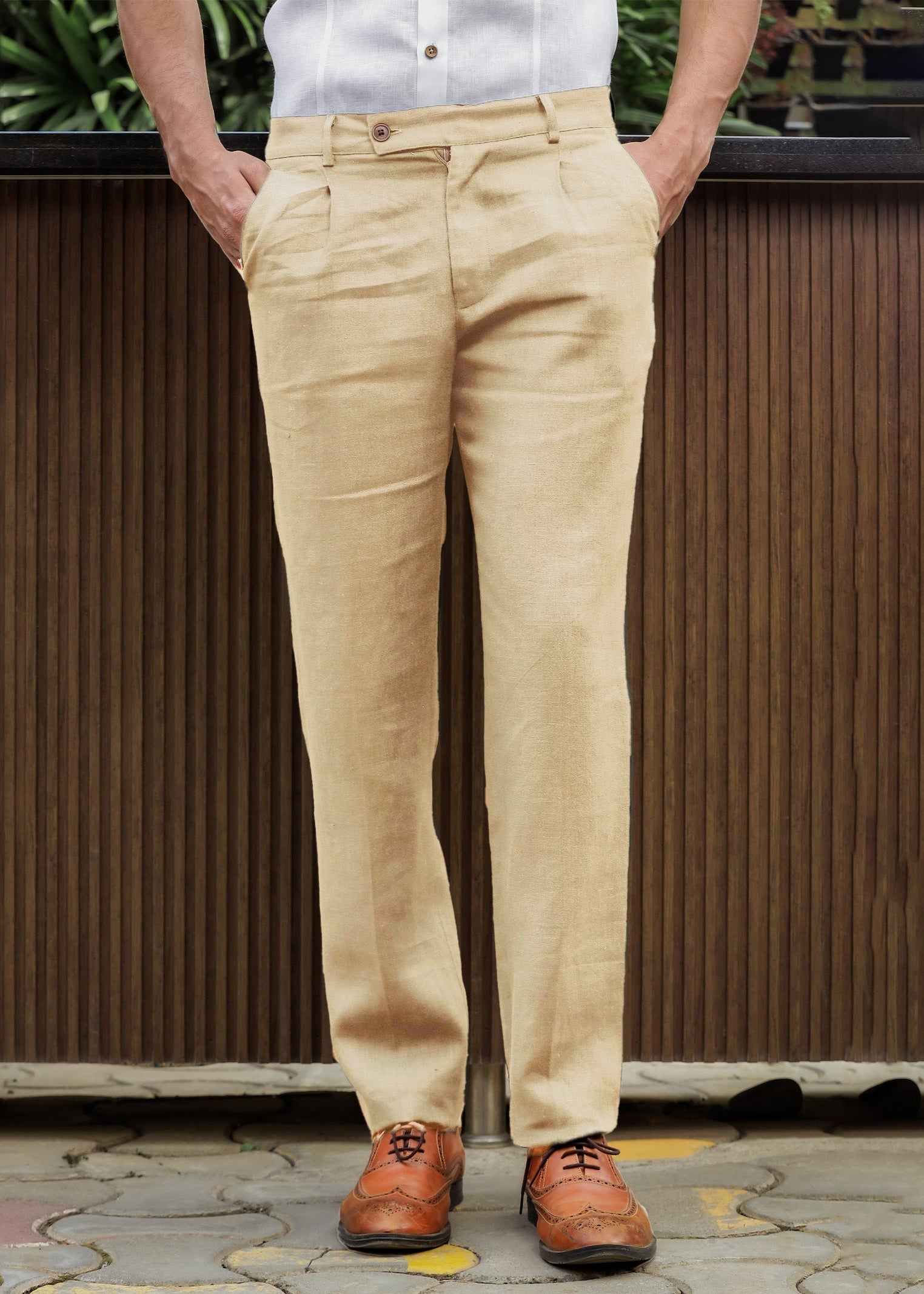 Classic pleated linen trousers in Cappuccino Beige offer timeless style and comfort for all seasons. The front pleats ensure ease of movement, while pairing them with our 100% Pure Linen Shirts creates a polished look.