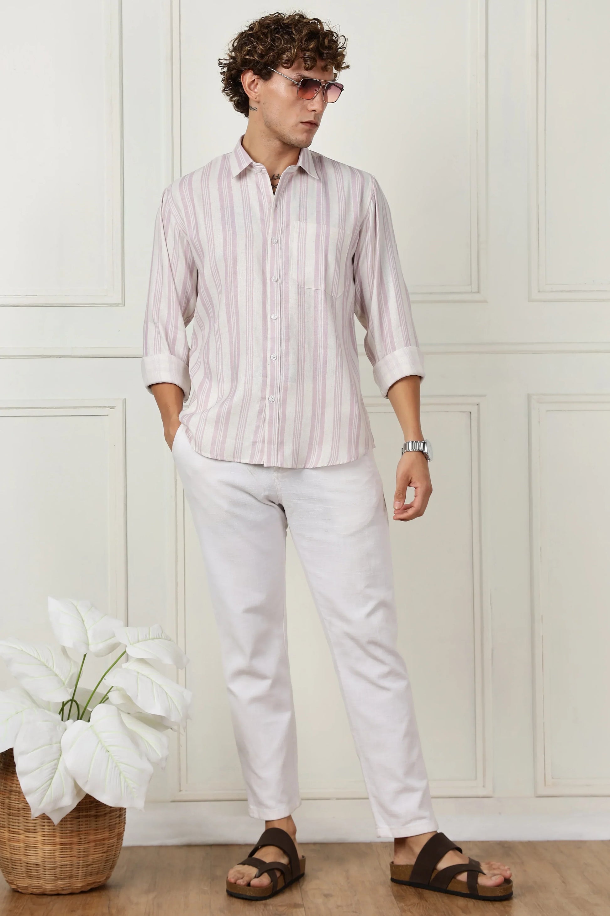 Lavender stripe printed full sleeve linen shirt