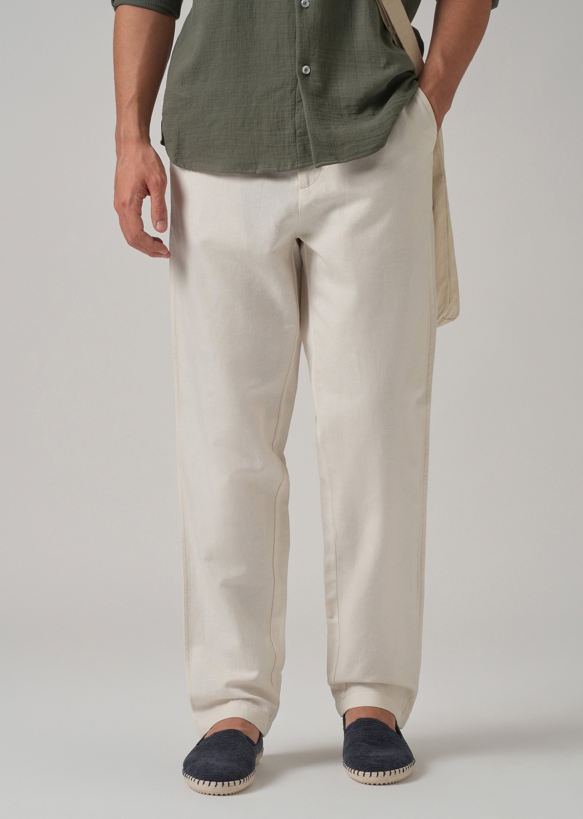 These versatile trousers feature a semi-elasticated waistband for added comfort and a button closure with belt loops for a personalized fit. With two side pockets and two welt pockets at the back. The relaxed fit offers comfortable feel.
