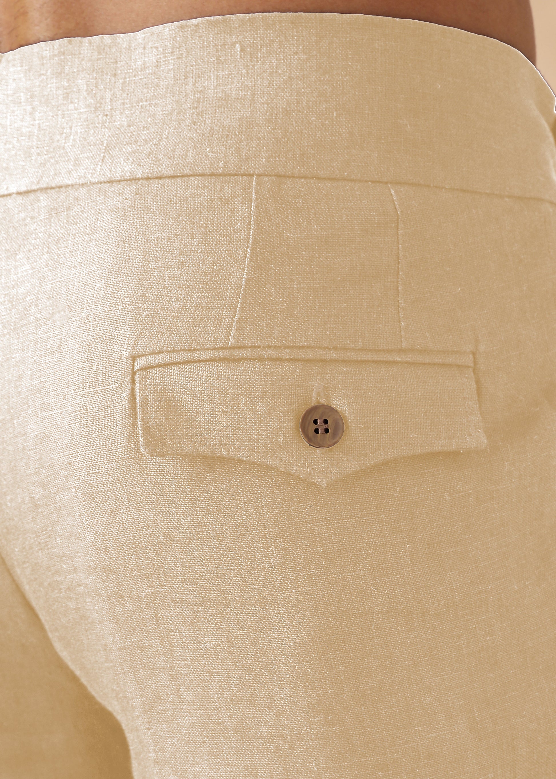 Expertly crafted from pure linen, these double pleated trousers boast a unique overlap button detail on the front waistband. These Cappuccino Beige pants are both stylish and breathable, perfect for any occasion. Elevate your wardrobe with these sophisticated yet comfortable trousers.