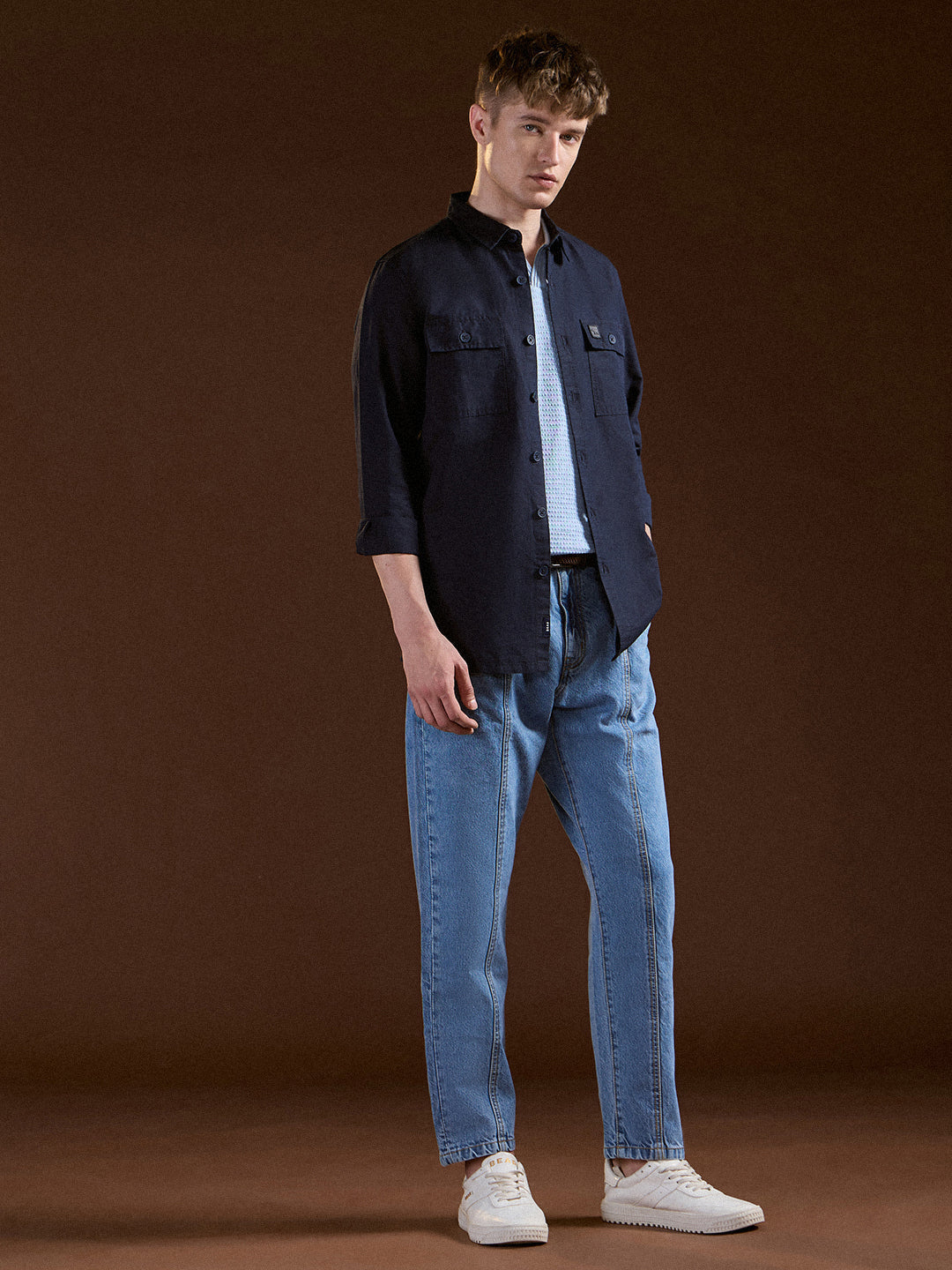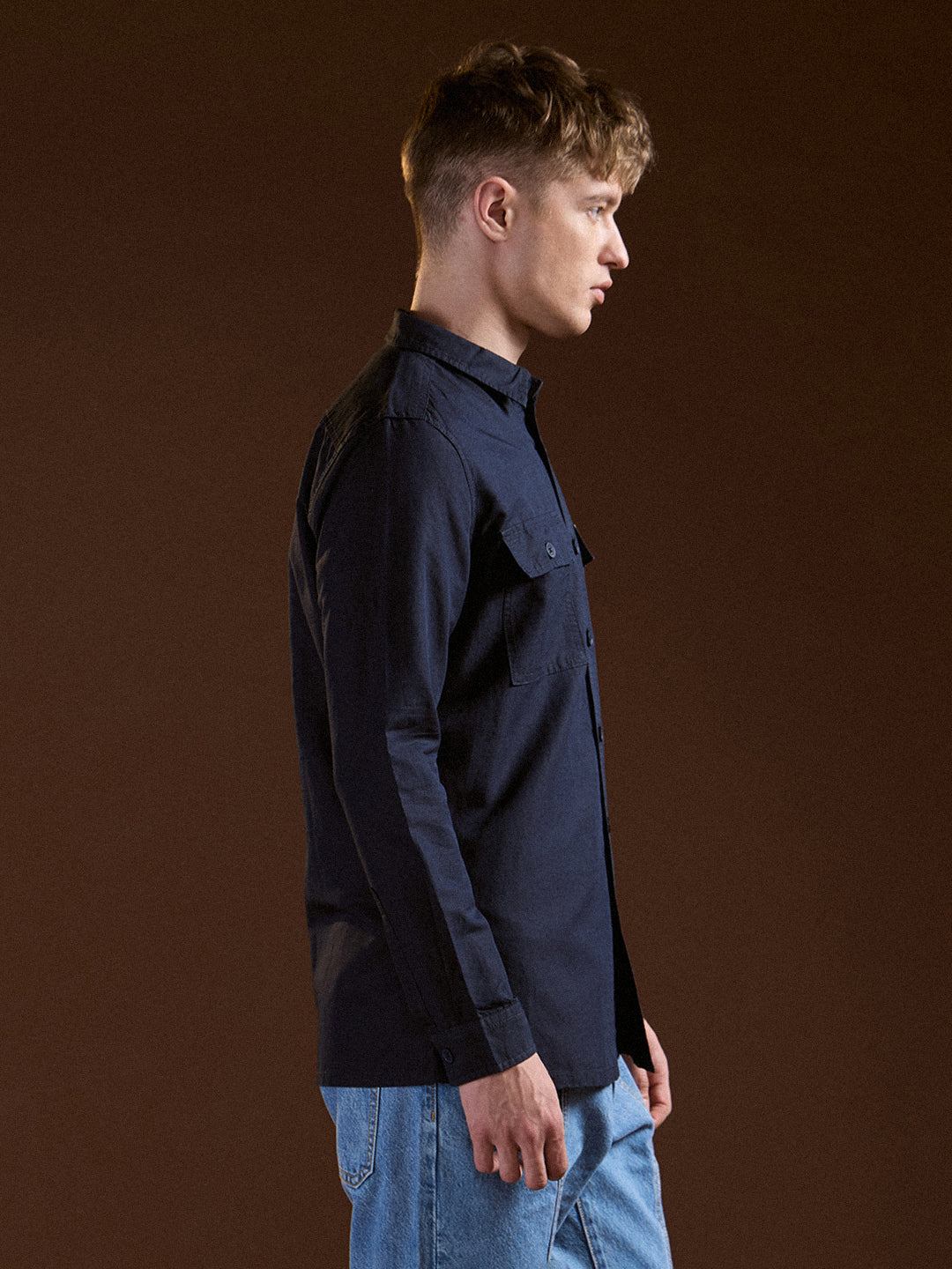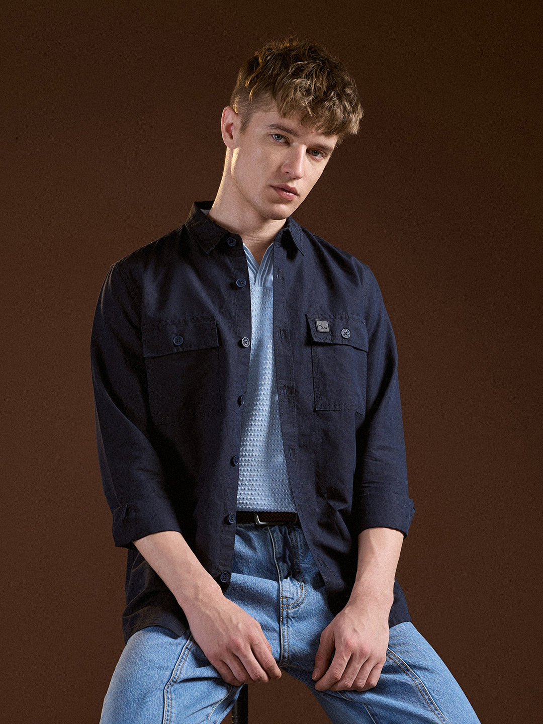 Blue Solid Slim Fit Casual Shirt with Flap Pockets