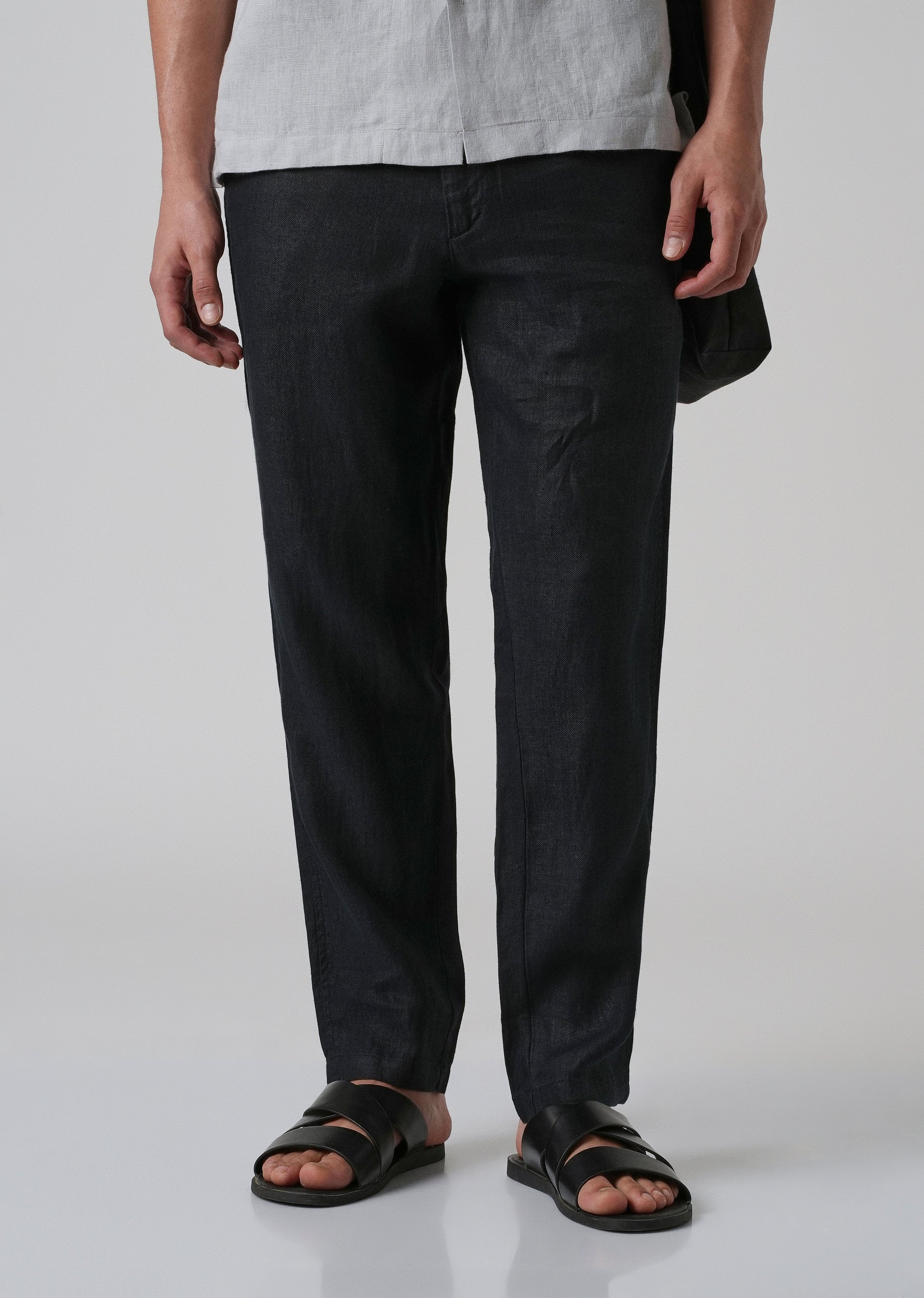 - Trousers in airy linen with covered elastication and a concealed drawstring at the waist.
